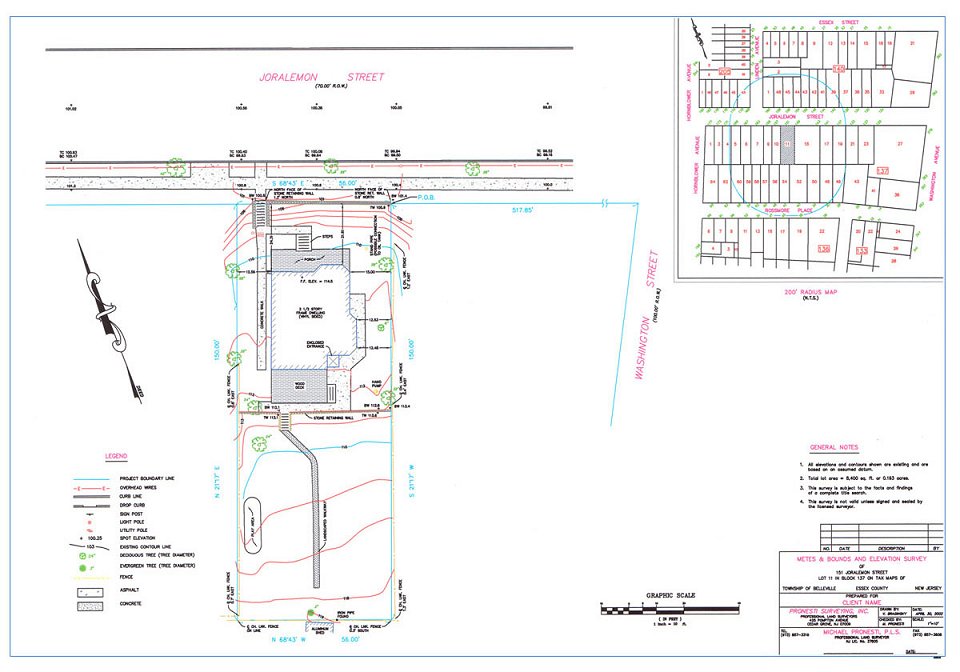 The scope of a Topographic Survey may include: - Metes and Bounds Survey - Location of physical features on site - Spot elevations on site - Spot elevations at top and bottom of curbs along street - Finished Floor Elevation - Contours - Available utilities above and below ground - Rim and inverts on sanitary and storm structures - Location of street hardware - Location of any tree lines and wooded areas - Description of Property - 200' Radius Area Map |